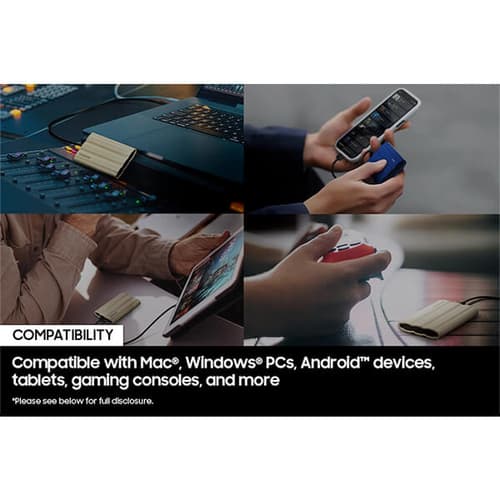 The T7 Shield is compatible with PC, Mac, Android devices, gaming consoles, and more. Included in the box are USB Type C-to-C and Type C-to-A cables for added convenience.
